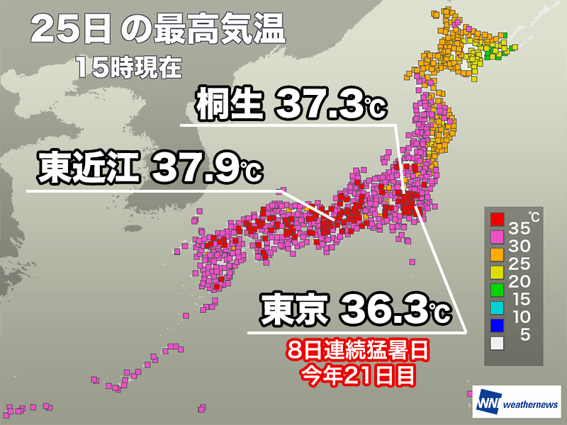 東京の猛暑日 8日連続今年21日目 今日も35℃以上は100地点超