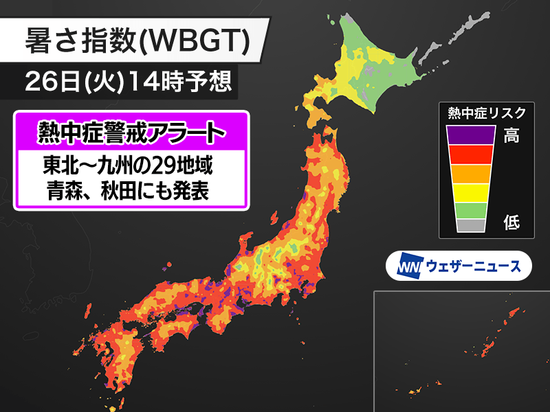 明日8月26日(火)の熱中症警戒アラート 東北北部から九州南部の29地域に発表