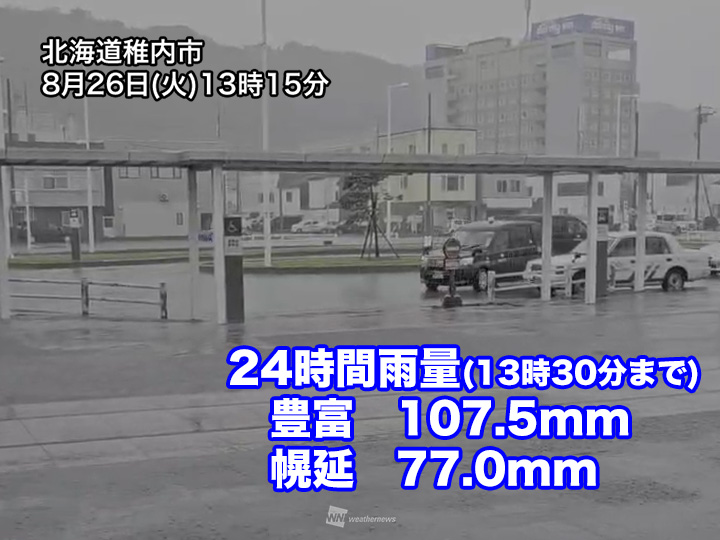 前線に伴う活発な雨雲が北海道の道北を次々に通過していて、断続的に強い雨が降っています。宗谷地方の豊富町では昼前から雨の勢いが増し、12時20分までの1時間には31.0mmの激しい雨を観測しました。24時間雨量は13時30分の時点で107.5mmに達しています。