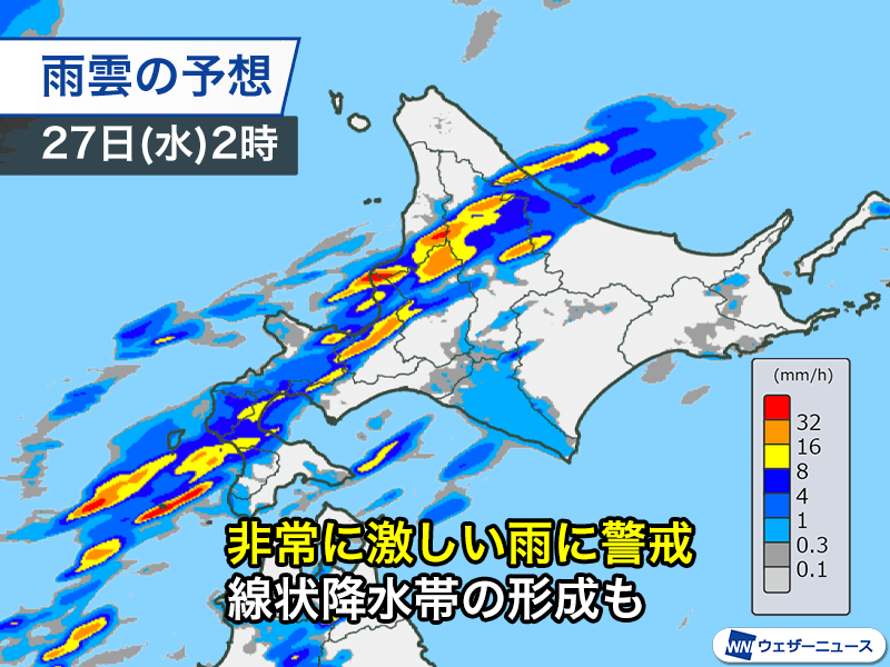 気象庁は「上川・留萌地方および石狩・空知・後志地方では、27日(水)未明から朝にかけて、線状降水帯が発生して大雨災害発生の危険度が急激に高まる可能性がある」との情報を発表しました。