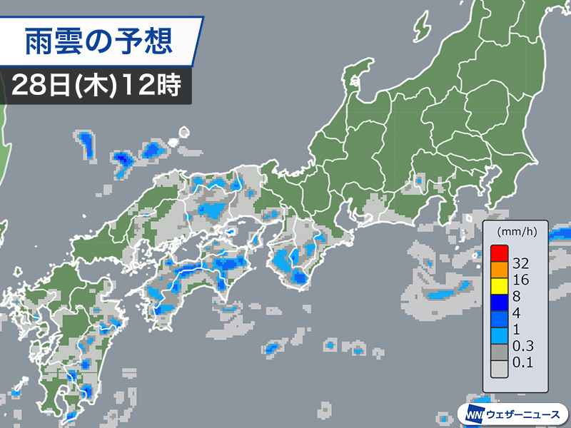 前線は今日の午後にかけて本州付近を南下し、明日28日(木)は活動が弱まる見込みです。しかし、南からの湿った空気が流れ込む影響を受けやすくなるため、関東や西日本などでも雲が多く、雨が降る所がある見込みです。