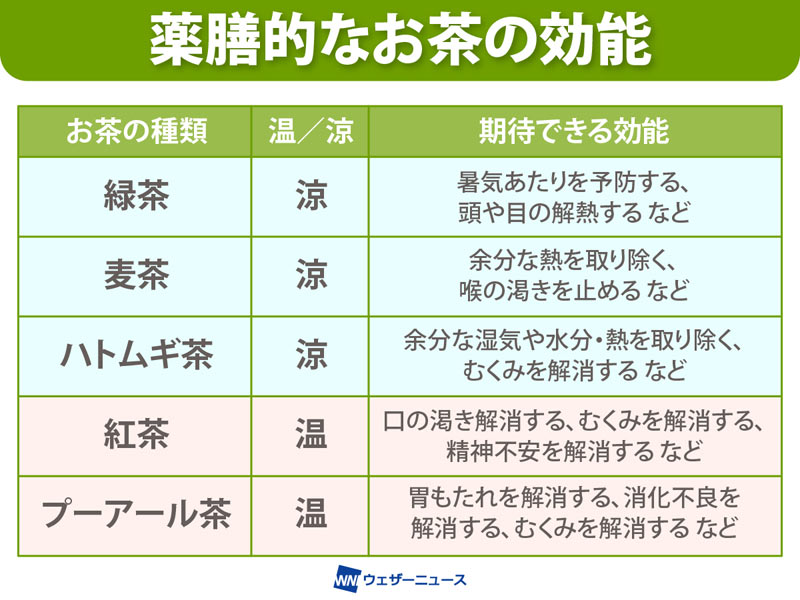 東洋医学・薬膳では、体を温めたり冷やしたりするなど、食材ごとにさまざまな効能が明らかになっているそうです。お茶も、種類によって効能が異なるのでしょうか。
