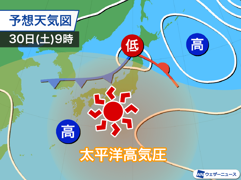 30日(土)は東京都心で36℃まで上昇し、仙台市でも35℃の猛暑日を予想しています。群馬県伊勢崎市や埼玉県熊谷市、甲府市などは39℃の危険な暑さです。