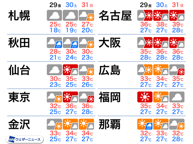 8月最後の週末は猛烈な暑さ 名古屋は31日(日)に39℃の予想