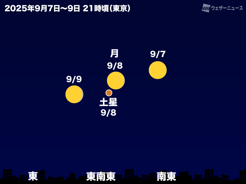 土星が衝を迎える前、9月8日(月)夜から9日(火)明け方には、月と土星の接近も楽しめます。満月直後のお月さまと、0.7等の土星の共演に注目です。