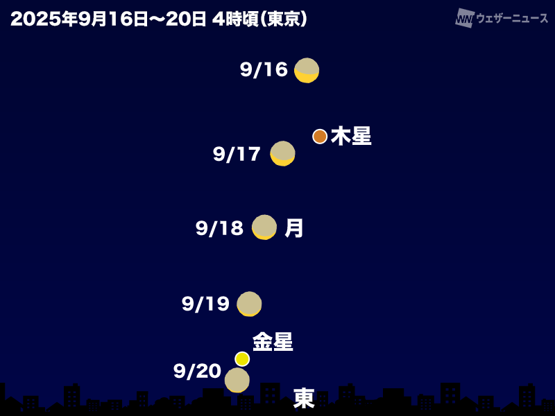9月17日(水)深夜から明け方には月が木星と接近し、20日(土)の未明から明け方には細い月が金星と近づくため注目です。月と金星の接近は空の低い位置で起こるため、東の空が開けた場所からお楽しみください。