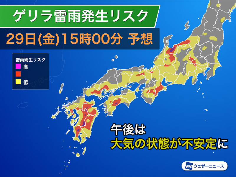 今日29日(金)の西日本や東日本は高気圧に覆われ、朝から強い日差しが照りつけています。気温が上がるにつれて大気の状態が不安定になり、内陸部や山沿いを中心に雨雲が発生し、雷雨となる可能性があります。