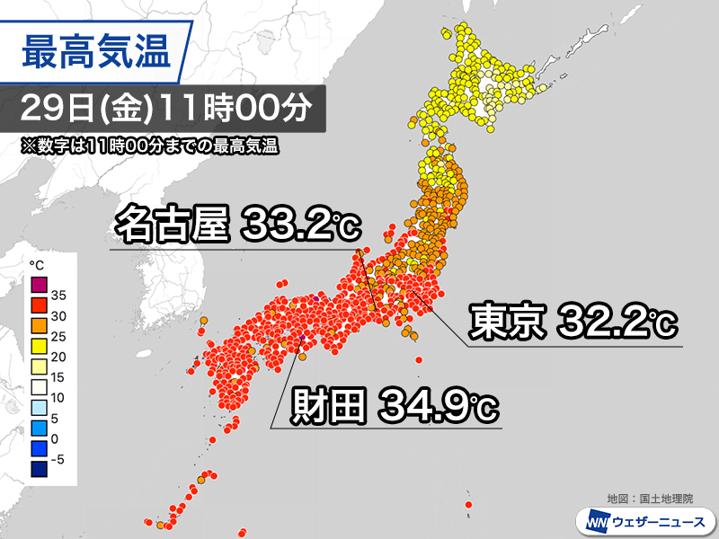 今日29日(金)11時までに、東京32.2℃、名古屋33.2℃、大阪33.1℃、福岡33.8℃まで上がりました。11時までに最も気温が高くなったのは、香川県三豊市財田で34.9℃です。各地で真夏のような厳しい暑さが続いています。