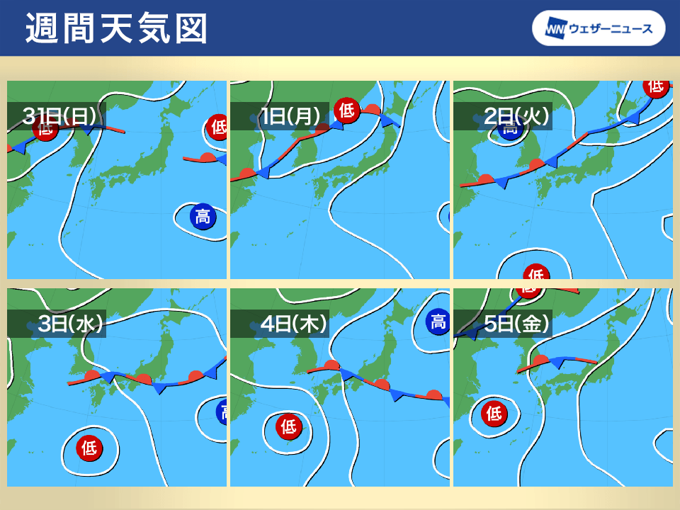来週中頃には、前線や低気圧がゆっくりと本州を南下し、東日本や西日本でも曇りや雨の所が多くなる予想です。