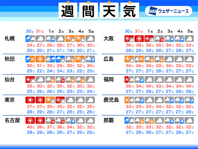 前線の南下により上空の暖気が後退し、日差しも少ないため35℃以上の猛暑日となる日は少なくなる見通しです。