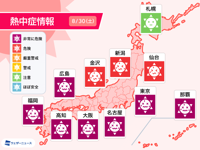 明日8月30日(土)の天気予報 関東から西はさらに気温上昇 危険な暑さに要警戒
