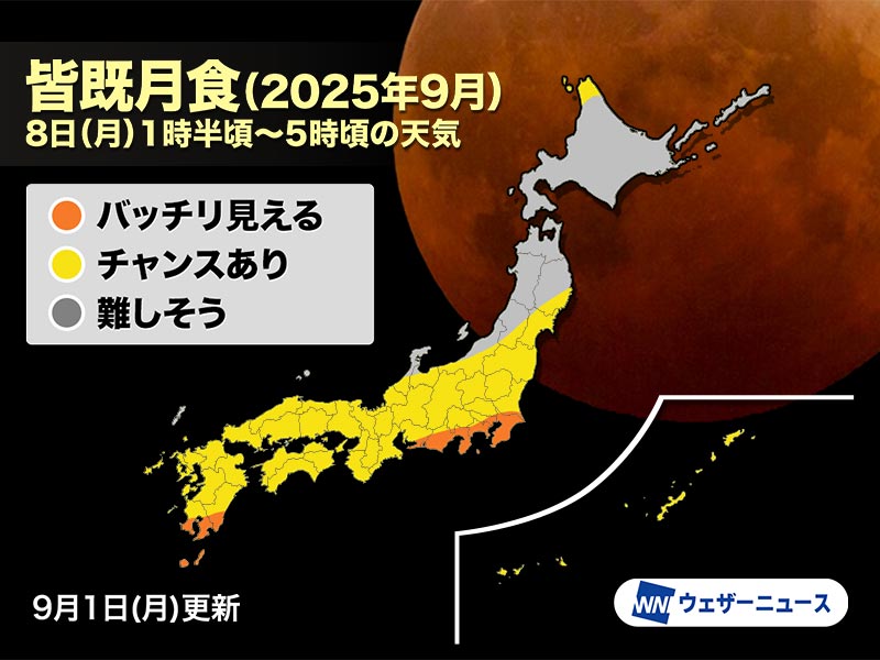7日(日)深夜〜8日(月)明け方は、秋雨前線に相当する雲の帯が日本付近に形成される可能性が高くなってきました。この前線の位置と活動の程度次第で、月食が見えるかどうかが変わってきそうです。現時点での予想では、月食の時間帯には前線は日本海〜北日本付近を南下しているタイミングになるとみています。北陸〜北日本はこの雲の影響を受けて天体観測の難しい天気となってしまいそうです。