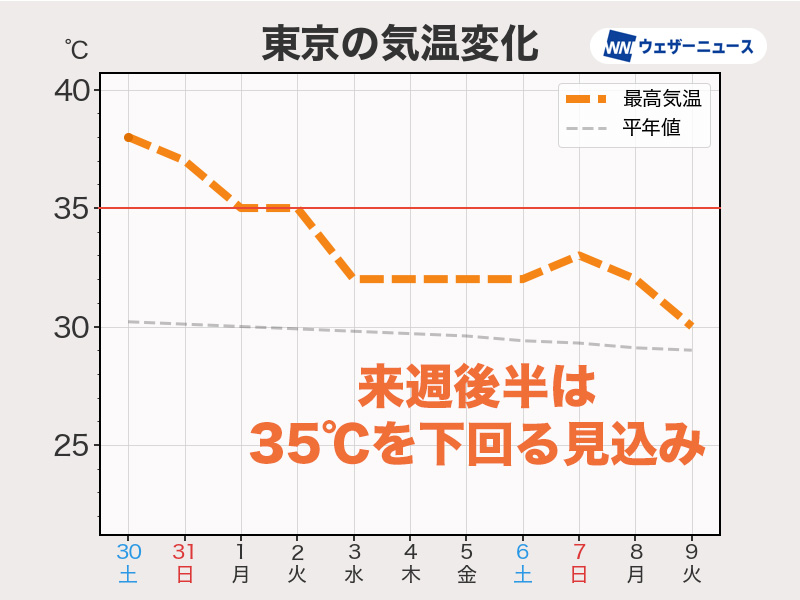 9月に入り来週後半になると前線の南下により上空の暖気が後退し、日差しも少ないため35℃以上の猛暑日となる日は少なくなる見通しです。