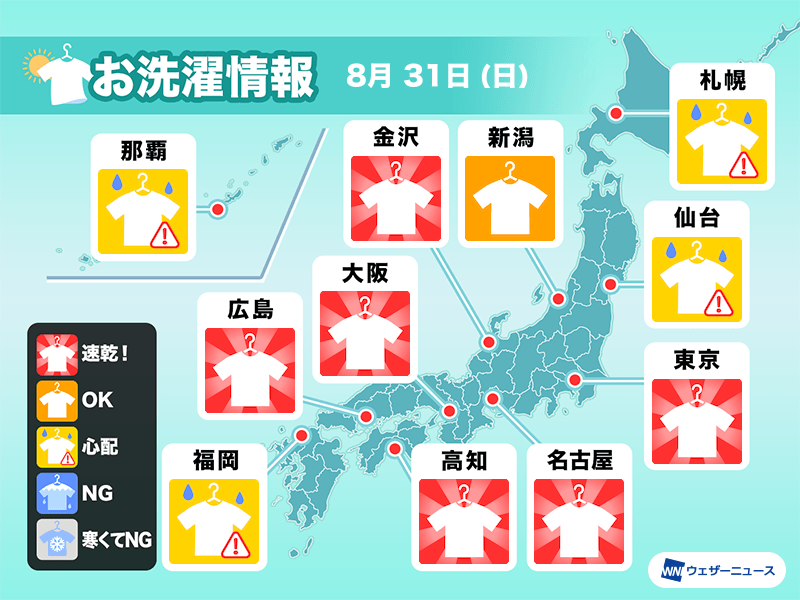 関東から中国・四国は強い日差しが照りつけ、外干しした洗濯物もしっかり乾きます。東京や大阪、名古屋などでは「速乾!」の予報が出ており、午前と午後に2回干すこともできそう。