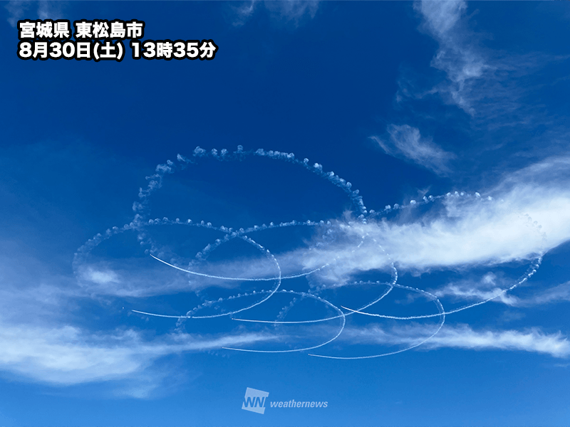 今日の東松島市周辺は青空が広がりつつも雲が多い空となっています。空の青とブルーインパルスの白煙のコントラストが印象的な展示飛行となりました。