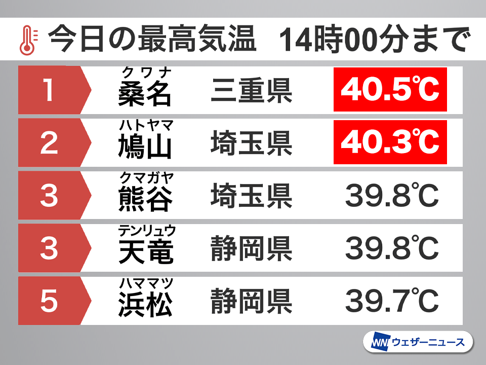 14時00分の時点で全国最高となっているのは三重県桑名市で40.5℃。次いで埼玉県鳩山町が40.3℃、埼玉県熊谷市と静岡県浜松市・天竜で39.8℃、名古屋市で39.0℃まで上がりました。国内で40℃以上を記録するのは8月6日以来で、39℃以上となった地点は8地点、35℃以上の猛暑日は214地点です。