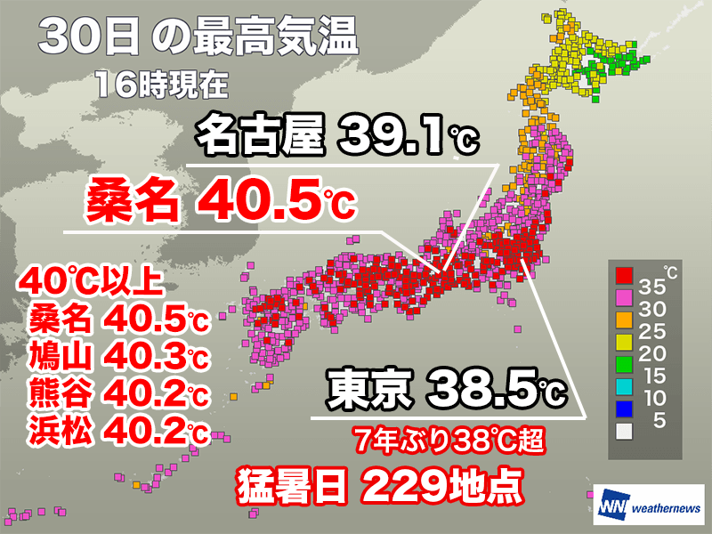 西寄りの風でフェーン現象が発生した所もあり、16時までの最高気温は三重県桑名市で40.5℃、埼玉県鳩山町で40.3℃、熊谷市と静岡県浜松で40.2℃を観測しています。