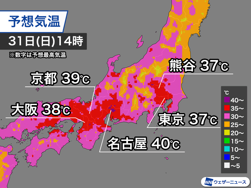 8月最終日の明日も東海で40℃か 近畿も危険な暑さに