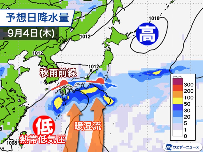 熱帯低気圧は太平洋高気圧の縁を沿うように沖縄方面に北上し、前線に向かっては南から暖かな空気が流れ込みやすくなります。前線の活動が活発になり、周辺では雨雲が発達しやすくなる予想です。