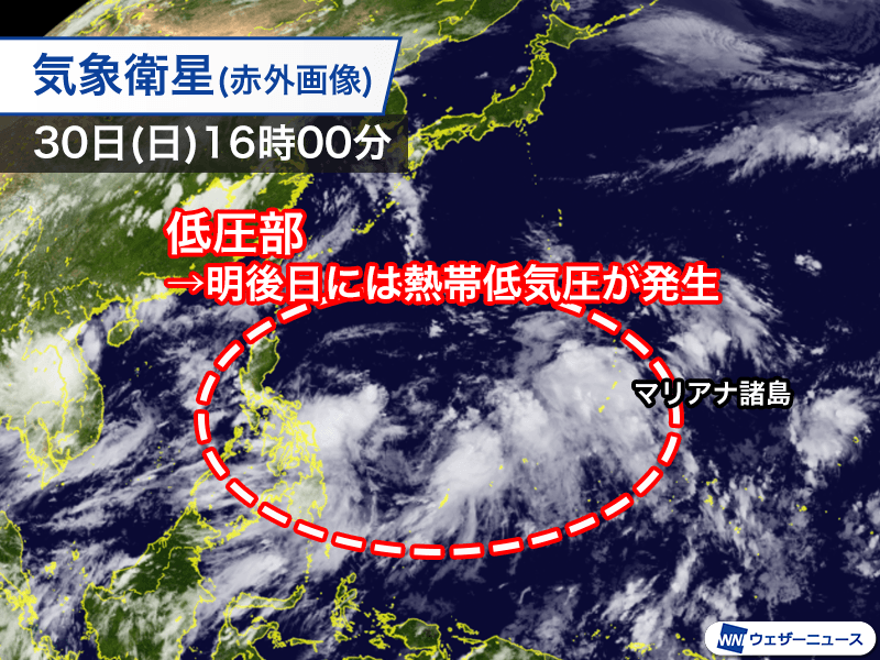 明日から明後日にかけて次第に渦が明瞭になり、熱帯低気圧が発生する見通しです。周辺の海面水温は30℃以上で発達するためのエネルギーは豊富にあります。風の環境などが整えば台風まで発達してもおかしくありません。