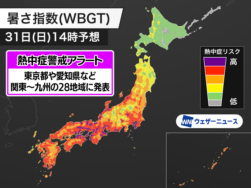 今日8月31日(日)の熱中症警戒アラート 関東から九州の28都府県に発表