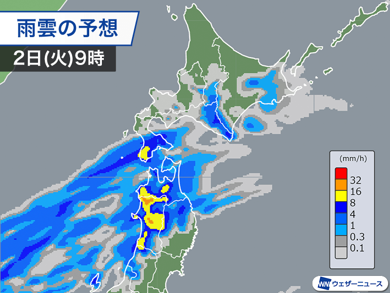 2日(火)にかけて、前線を伴った低気圧が北日本付近を通過する見込みです。北日本では広範囲で雨が降り、強雨や雷雨に注意が必要です。