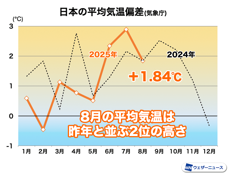 都市化の影響が比較的小さい全国15か所の代表地点(※)の観測値による、8月の日本の平均気温偏差は+1.84℃でした。これまで最も高かった2023年には及ばなかったものの、昨年2024年と並ぶ過去2番目の高さです。