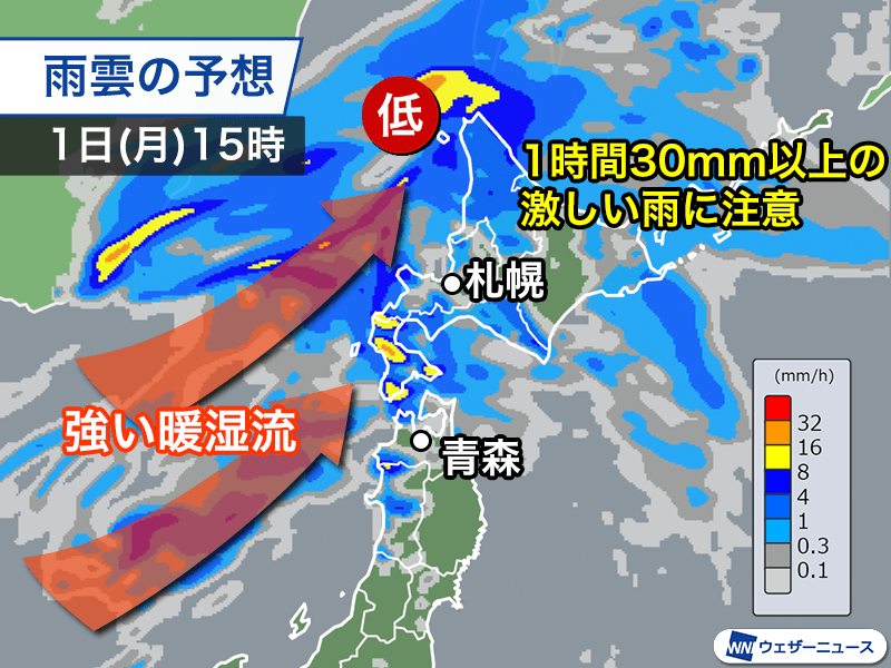 低気圧が近づく午後は雨の範囲が広がり、北海道のほぼ全域で傘が必要な雨になるとみられます。低気圧に向かって南西から暖かく湿った空気が強く流れ込むことで雨雲が発達しやすく、日本海側の広い範囲や日高地方などで1時間に30mm以上の激しい雨が降る見込みです。道路冠水や河川の増水、土砂災害などに注意をしてください。