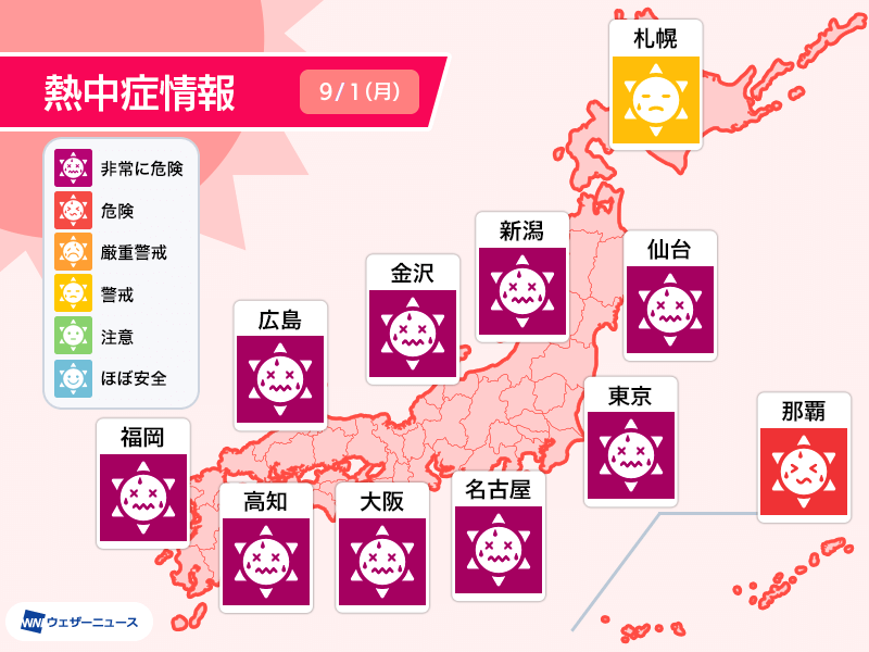 昨日ほどではないものの、厳しい暑さに変わりはなく、熱中症リスクの高くなる見通しです。西日本、東日本はの広い範囲で「非常に危険」ランクとなっています。