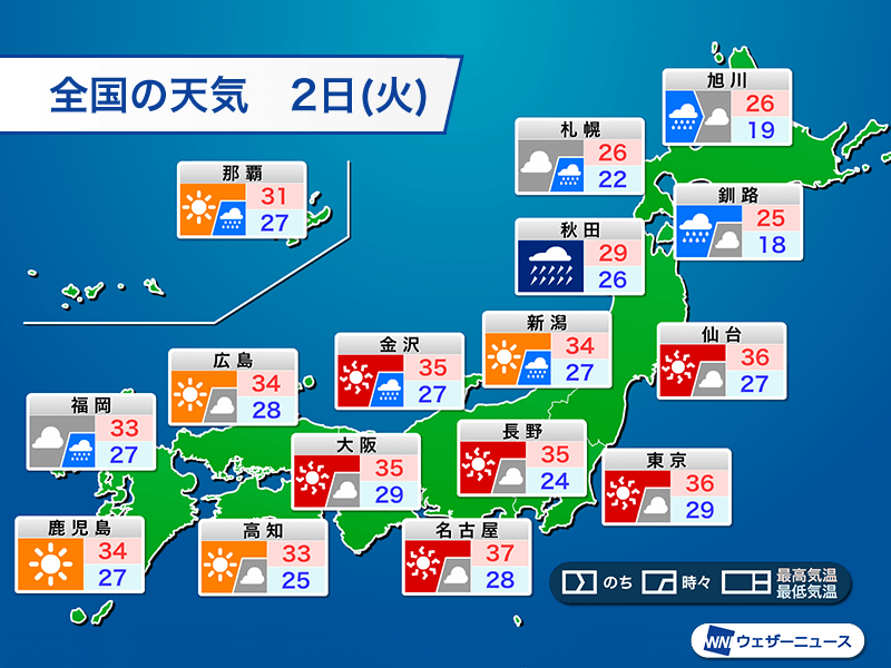 明日2日(火)は太平洋高気圧の勢力が今日よりもさらに後退するため、厳しい暑さのエリアは縮小します。それでも東日本を中心に気温が上昇し、東京都心や名古屋市などで35℃以上の猛暑日の予想です。