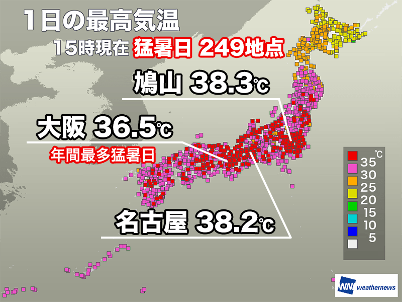 15時までの最高気温が全国で最も高くなったのは埼玉県鳩山町で38.3℃を観測。昨日は40℃を記録した名古屋市は、少し下がったものの38.2℃と酷暑に変わりありません。フェーン現象が発生した北陸なども気温が高く、富山市は38.0℃まで上がりました。
