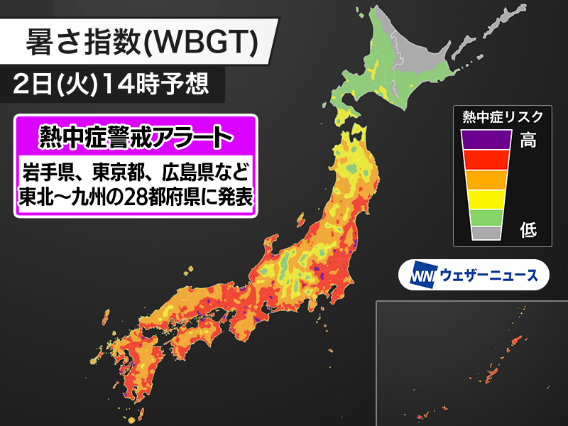 今日9月2日(火)の熱中症警戒アラート 東北から九州の28都府県に発表