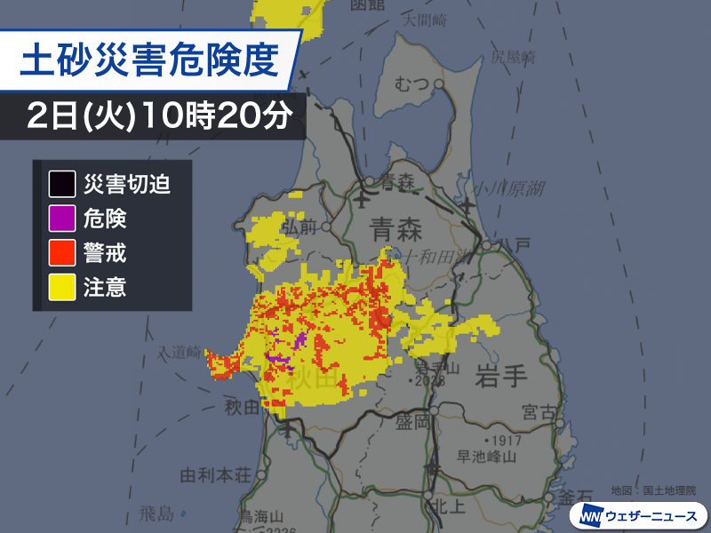 中小河川を中心に増水が目立っている上、土砂災害や浸水害の危険度も高くなっています。秋田県の広い範囲に土砂災害警戒情報が発表中です。