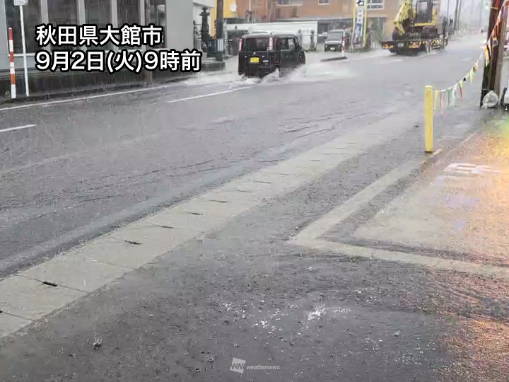 今日9月2日(火)は津軽海峡付近に前線がのびていて、南西からは非常に暖かく湿った空気が強く流入しています。大量の水蒸気が供給されているため活発な雨雲が次々に通過し、秋田県北部を中心に雨量が嵩んできました。
