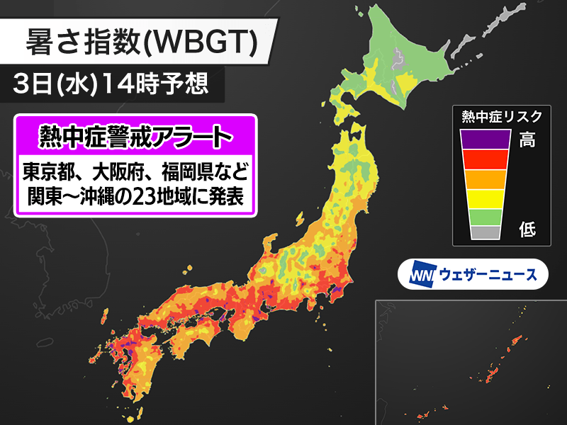 今日9月3日(水)の熱中症警戒アラート 関東から沖縄の23地域に発表