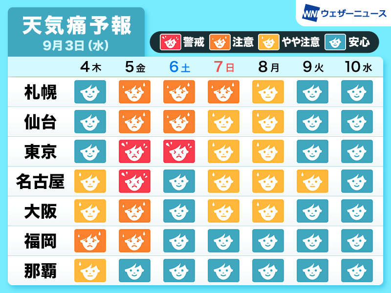 台風の接近・通過に伴い、明日から明後日は気圧が大きく変化し、東京や名古屋では「警戒」ランクの予想です。個人差はありますが、頭痛や関節痛などの天気痛の症状が出やすくなるため、注意が必要です。