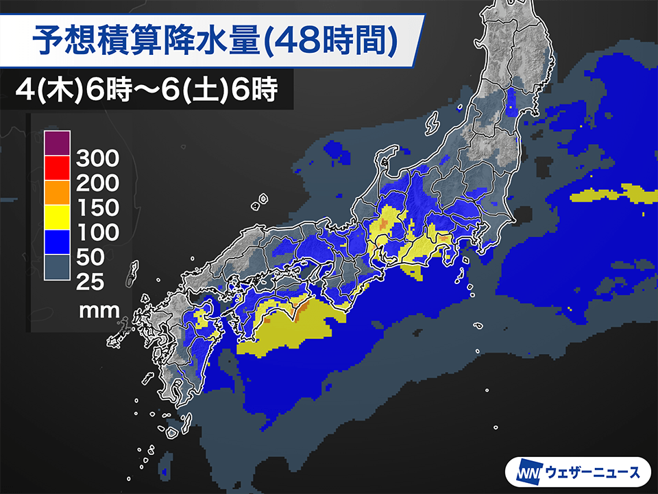台風が東に進む明日5日(金)になると、東海や関東など東日本太平洋側でも大雨のリスクが高まるとみています。