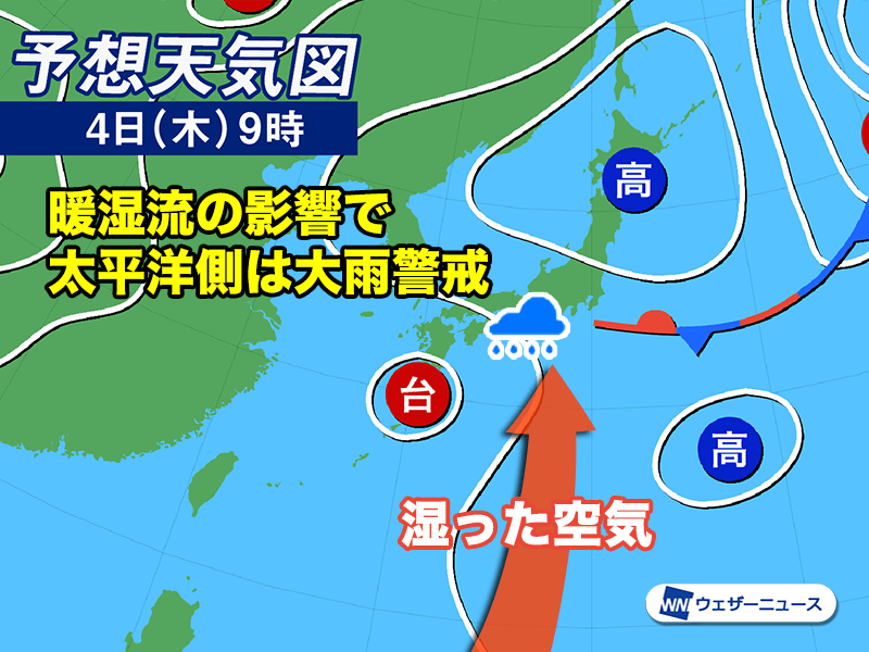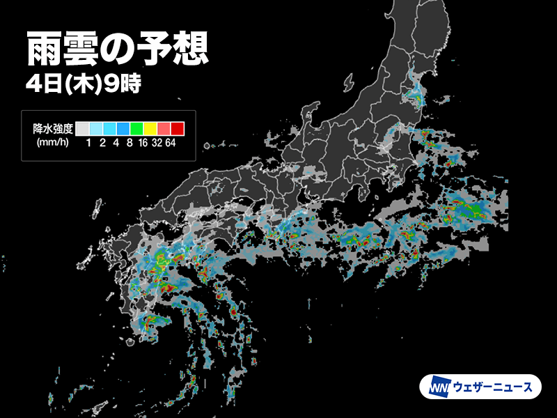 この熱帯低気圧と本州南の海上の太平洋高気圧の影響で南から暖かく湿った空気が流れ込み、本州の南岸には天気図に描かれない前線帯が形成されています。この前線帯は徐々に北上して西日本太平洋側の一部では既に雨が降り出していて、今夜から明日4日(木)にかけて西日本や東日本の広い範囲で雨が降り出す予想です。