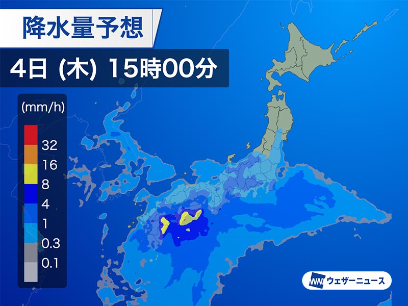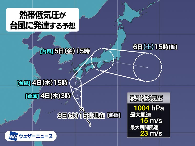 明日4日(木)は熱帯低気圧が台風にまで発達して九州南岸に接近し、上陸する可能性があります。