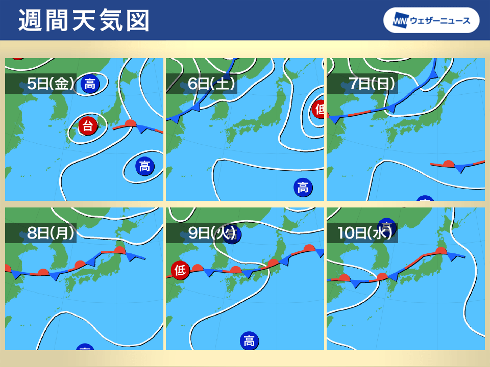 来週は日本列島付近に秋雨前線が形成され、停滞する日が多くなる予想です。この前線の活動度合いや位置次第で、各地の天気が左右されそうです。雨の降る可能性もあるため、こまめに週間予報の変化をご確認ください。