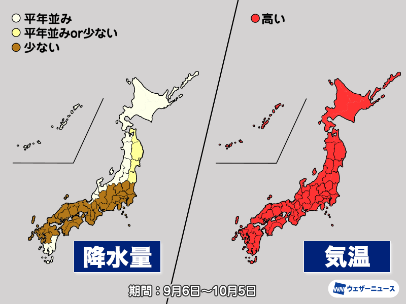 西日本、東日本を中心に高気圧に覆われやすく、平年よりも晴れる日が多い予想となっています。降水量は九州北部から関東甲信にかけて、平年よりも少なくなる見込みです。