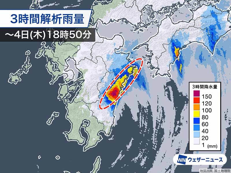 宮崎県北部平野部付近では非常に激しい雨が降り続き、3時間に150mmを超える雨が降ったとみられ、土砂災害や河川の氾濫が発生するおそれが急激に高まっています。