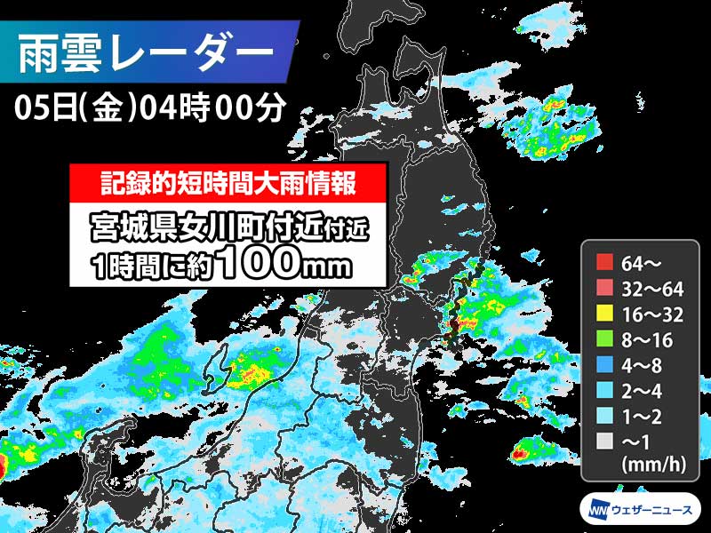 宮城県で1時間に約100mmの猛烈な雨 記録的短時間大雨情報