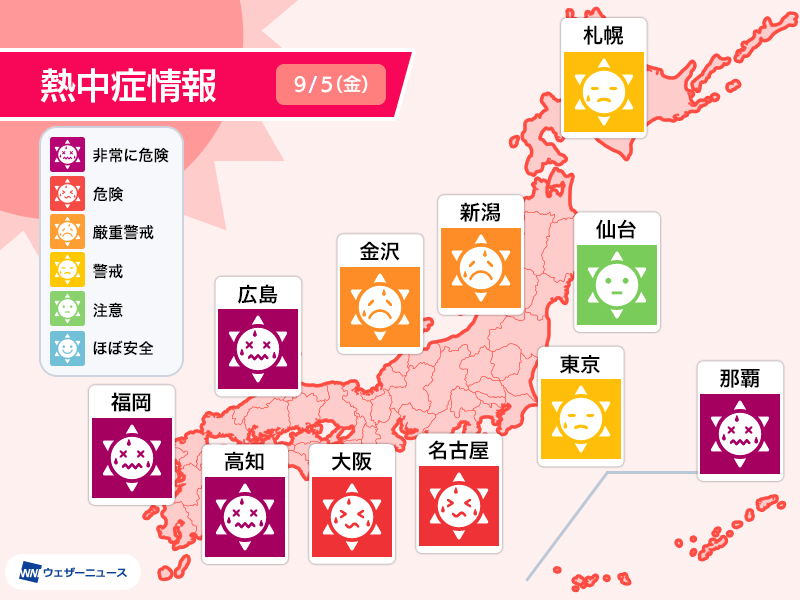 暖かな空気が残るところに日差しが戻るため、太平洋側は35℃以上の猛暑日になる予想です。大雨から一転して猛暑となりますので、熱中症対策が欠かせません。