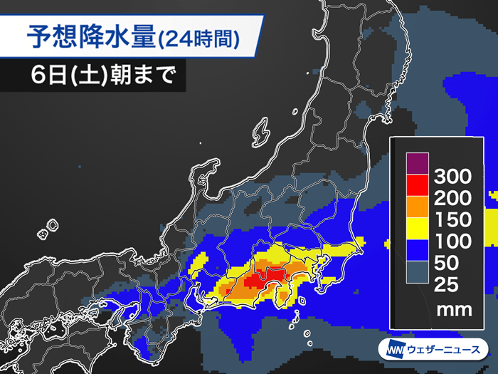 このあと、台風の東進に伴って西日本では雨雲から抜けるところが増えてきますが、東海から関東、東北では発達した雨雲がかかりやすい状況が続きます。今夜にかけて多いところでは200mm以上の大雨になるおそれがあるため、土砂災害や低い土地の浸水、都市河川の急な増水などに警戒をしてください。