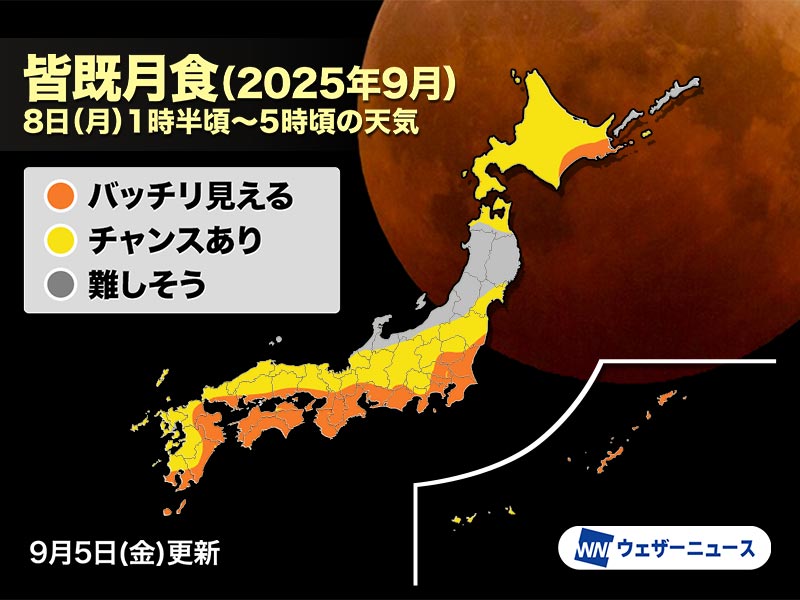 7日(日)深夜〜8日(月)明け方は、秋雨前線の雲が日本付近に近づいてきます。この前線の位置と活動の程度次第で、月食が見えるかどうかが変わってきそうです。現時点での予想では、月食の時間帯には前線は日本海〜北日本付近を南下しているタイミングになるとみています。北陸〜北日本はこの雲の影響を受けて天体観測の難しい天気となってしまいそうです。