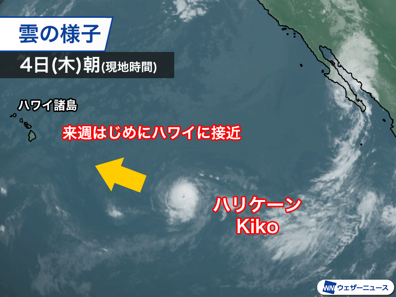 ハリケーンKikoで、発達のピークとなった現地時間の3日(水)夜には中心付近の最大風速が65m/sに達し、強い方から2番目のランクとなるカテゴリー4まで発達しました。その後はカテゴリー3にランクダウンしています。