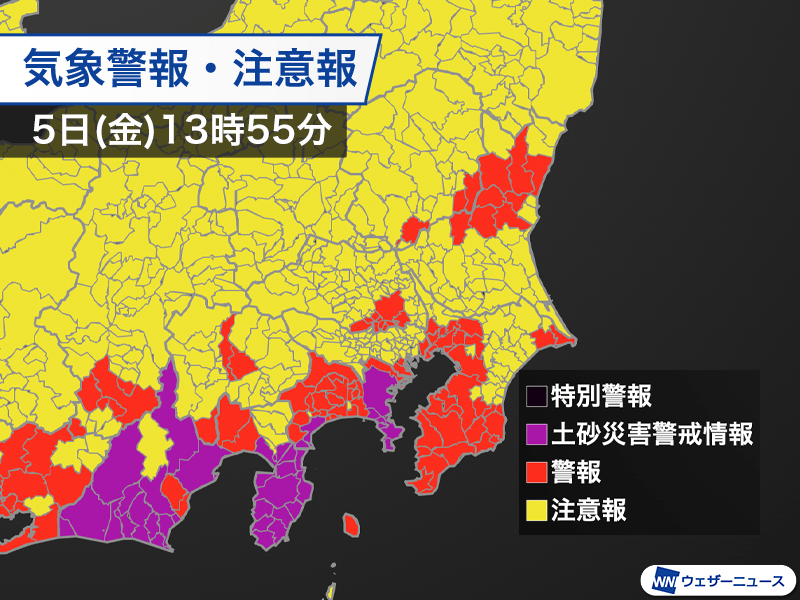 13時40分の時点で東京都や神奈川県をはじめとする関東の1都5県に大雨警報や洪水警報が発表中です。神奈川県には土砂災害警戒情報も出ていて、一部の地域には避難指示が発令されました。