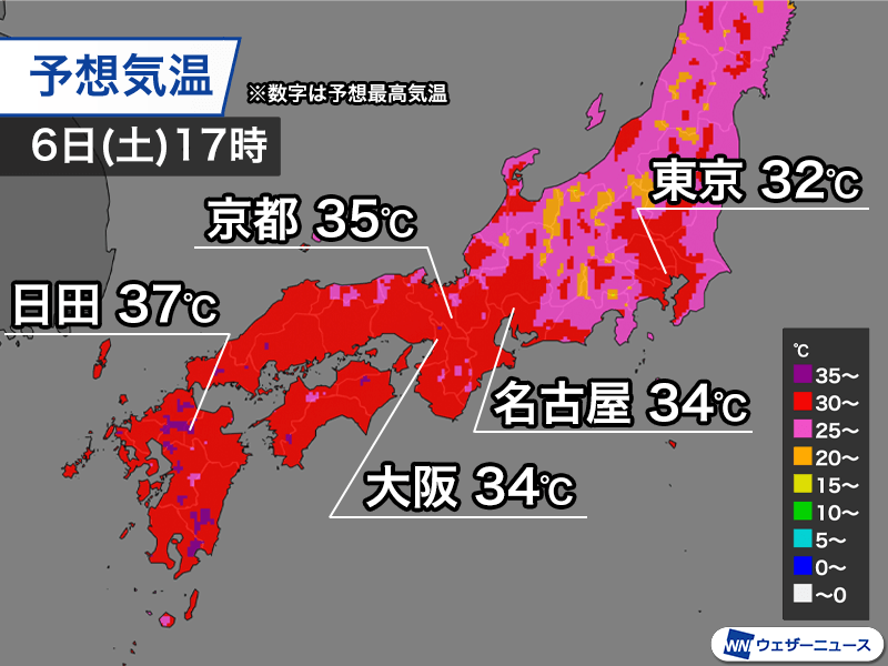 各地の最高気温は岐阜市や京都市で35℃、大分県日田市では37℃を予想しています。
