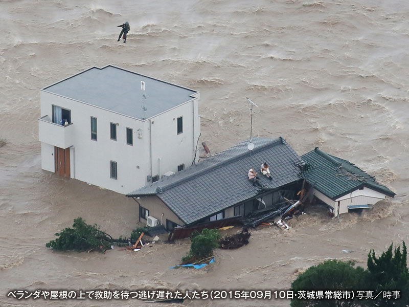 10~12日にわたった救助者数は茨城・栃木・宮城3県で計2256人。逃げ遅れて孤立した民家の屋根瓦や集合住宅のベランダ、電柱にしがみついた人たちが、消防防災ヘリコプターや警察、自衛隊の救命ボートなどにより救出されるニュース映像が、水害の恐ろしさを強く印象付けました。